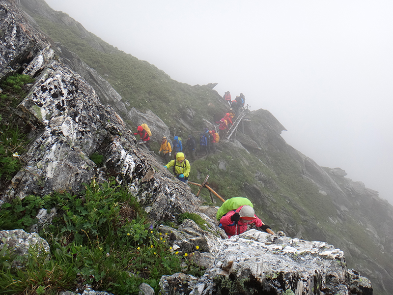 昨年は風雨が激しく間ノ岳まで到達できなかったので、今年はとの想いで臨みましたが、やはり稜線は強風。雨も混じる最悪のコンディションでした。