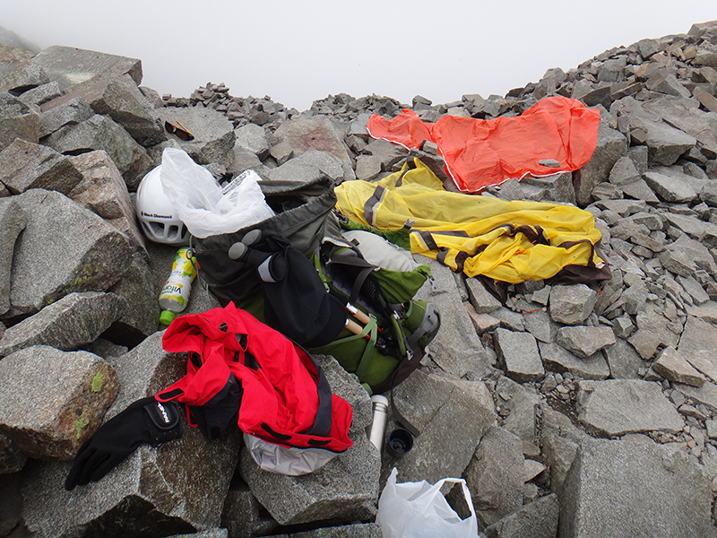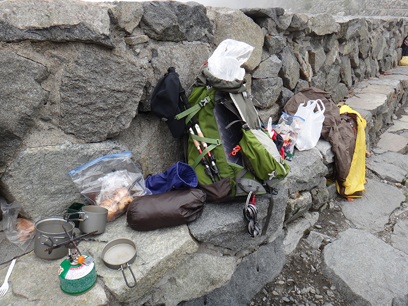 穂高岳山荘にて昼食ついでにザックの中身を乾かす。