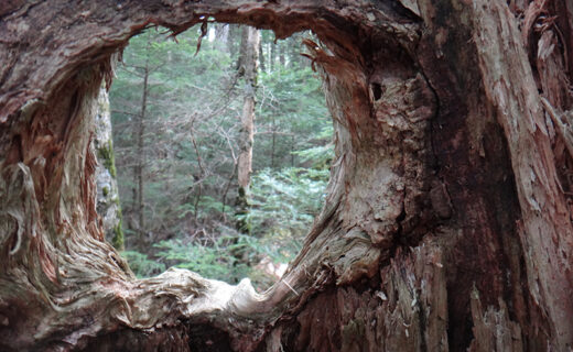 地衣に覆われたカラマツの枝。幻想の世界の生物のようにも見える。