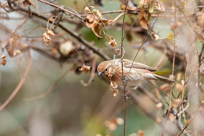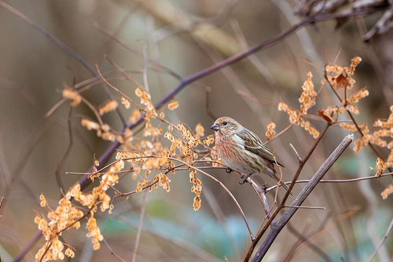 姿勢を低くしてローアングルで撮影しながら、オオマシコの移動に合わせて進みます。