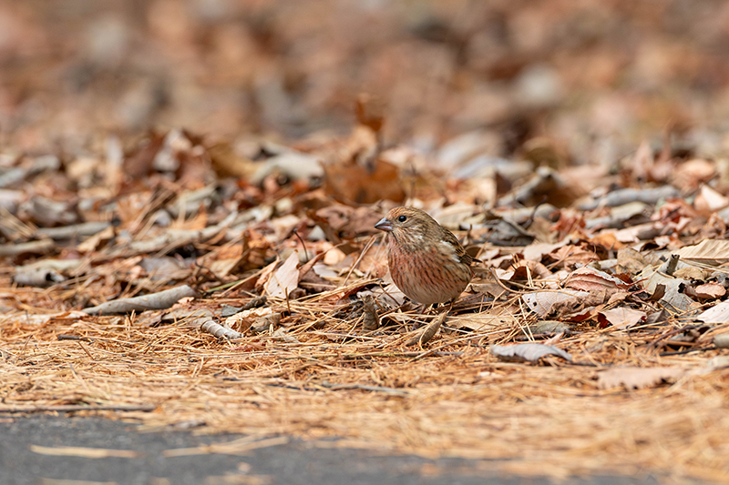 戻りかけて間もなく二羽のオオマシコが前方の道路に降り立ちました。