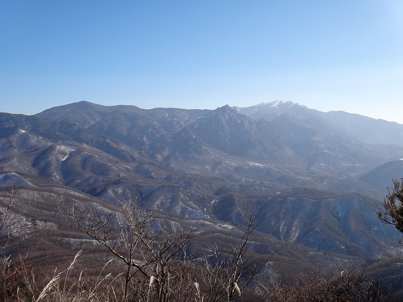 山頂からの展望は南西面のみですが、我が故郷の山、飯盛山へと続く尾根がはるかに見渡せるのも一興です。