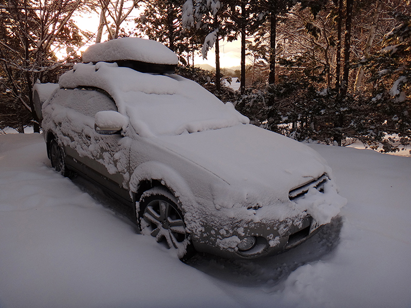 愛車のアウトバックもこの通り。この程度の降りではまだまだかわいいものですが。
