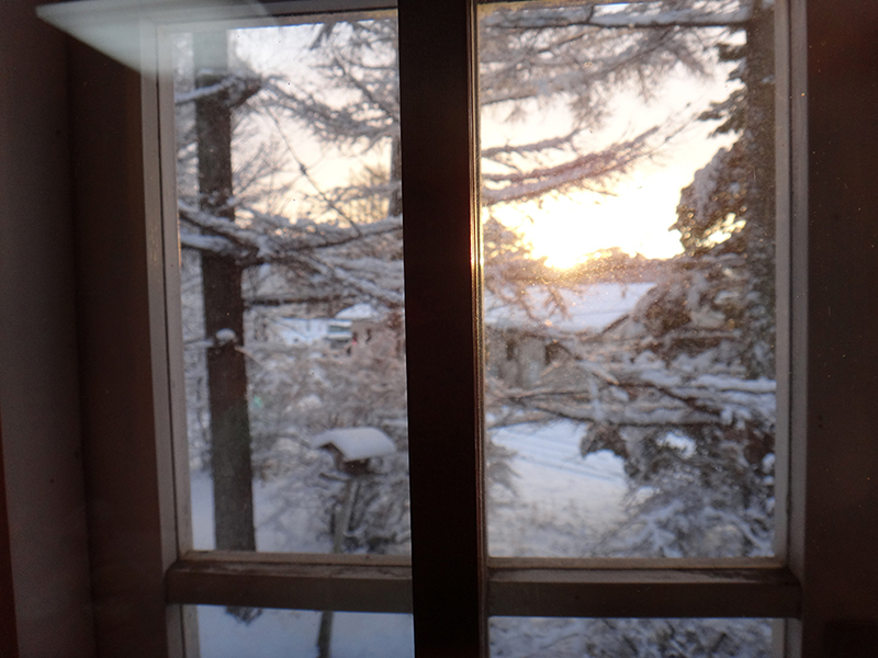 自宅横の朝の風景。カラマツ林に降り積もった新雪がきれいです。