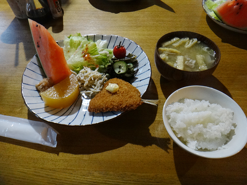 西岳山頂の写真無し。青年小屋定番のアジフライの乗った夕食です。