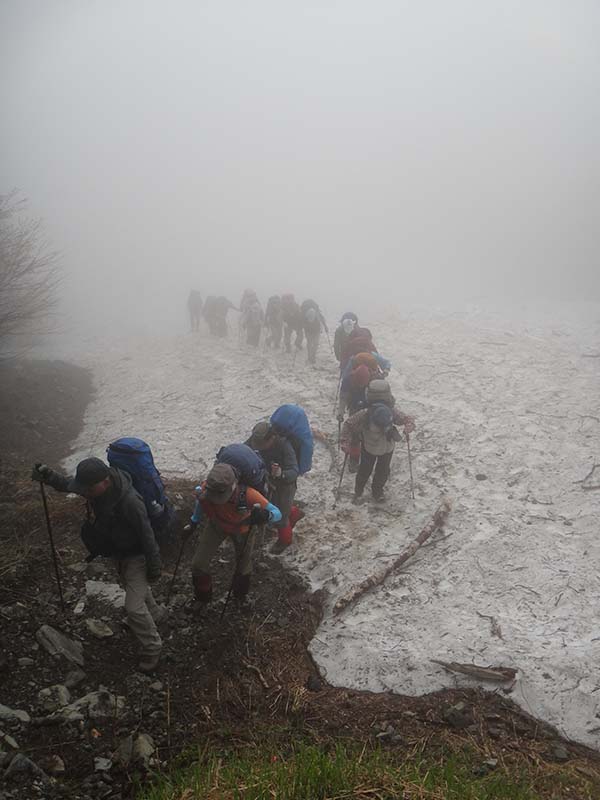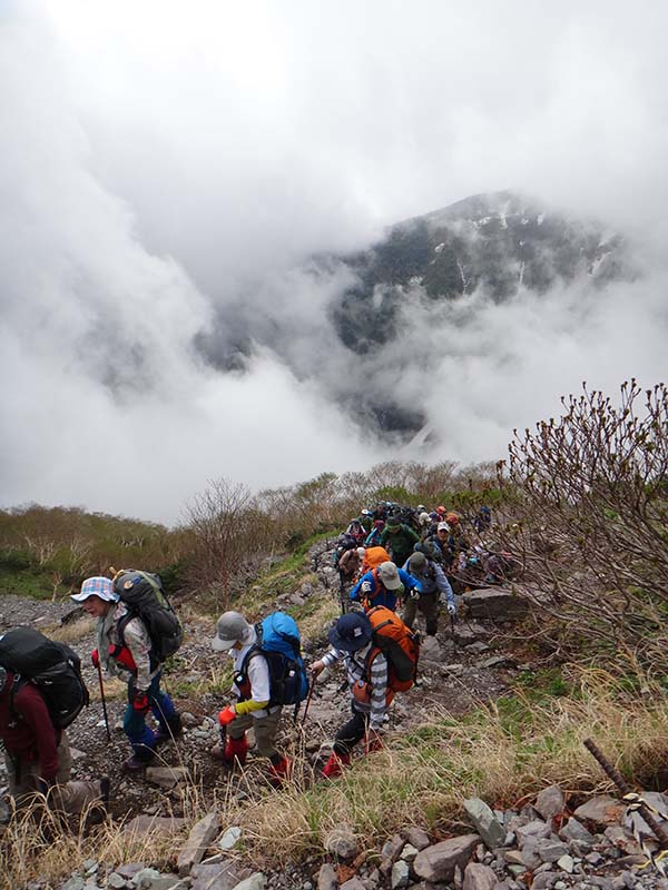 下山日は雨。北岳の登り返しで。