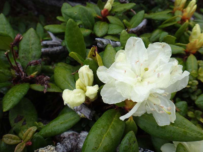 稜線に出ると例年より花々は遅いが、キバナシャクナゲの群落が勇躍、斜面を彩っている。