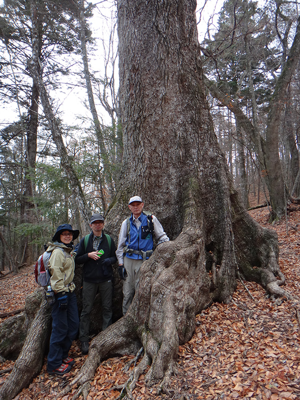 板根の発達したミズナラの根元で。