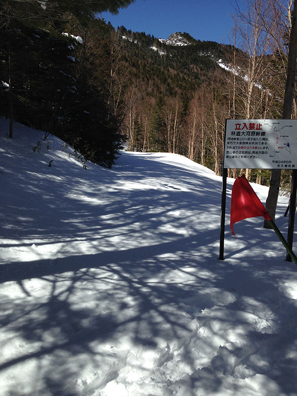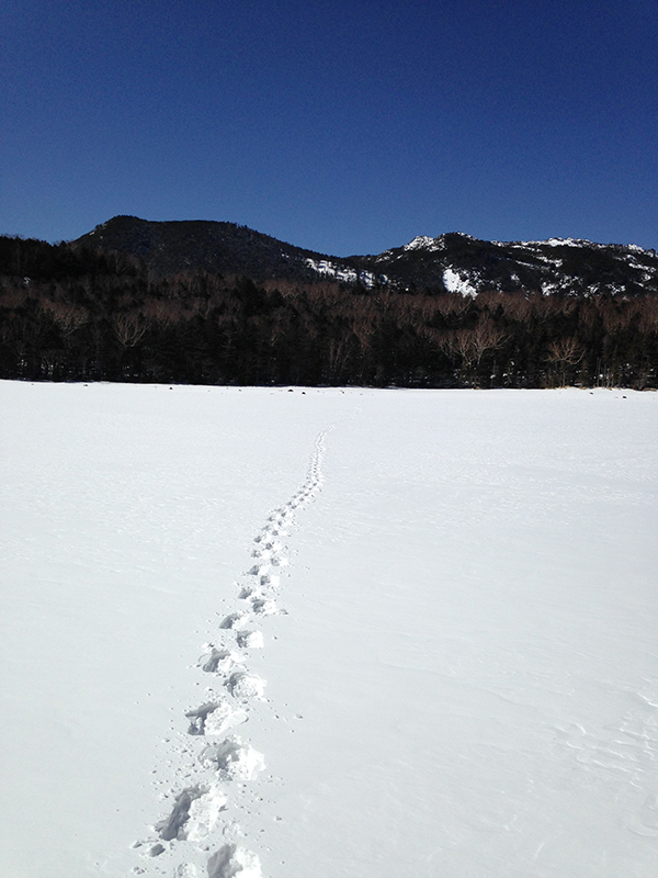 雨池ではまっさらな雪面にトレースを一本残し、八柱山へのルートには兎の足跡のみ。