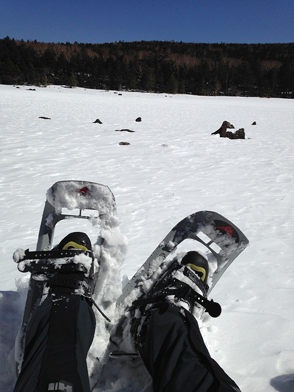 でも北東斜面を下り始めるとそれなりの積雪もあり、少々重い雪ながら十分スノーシューが楽しめる。