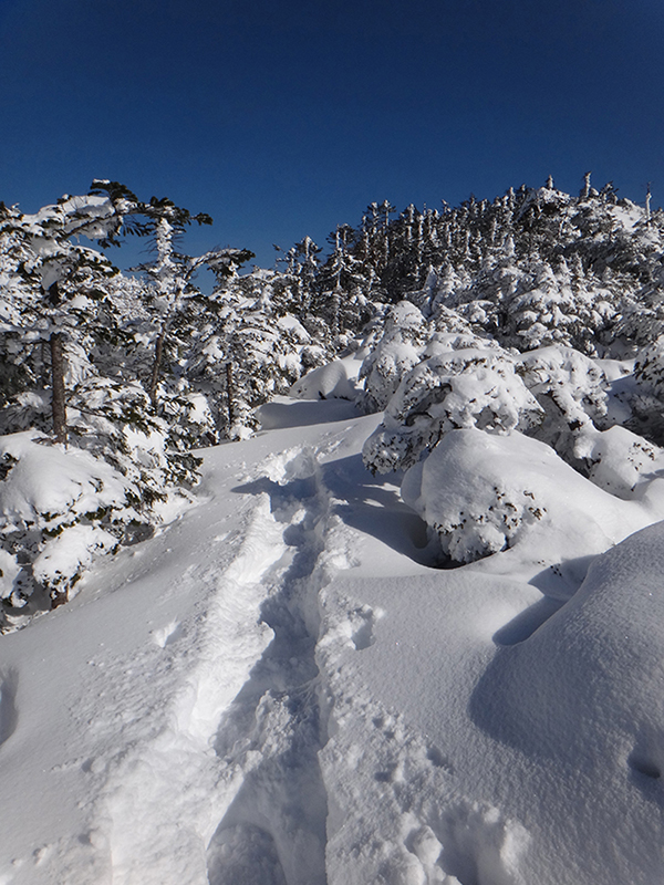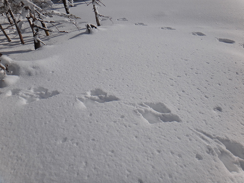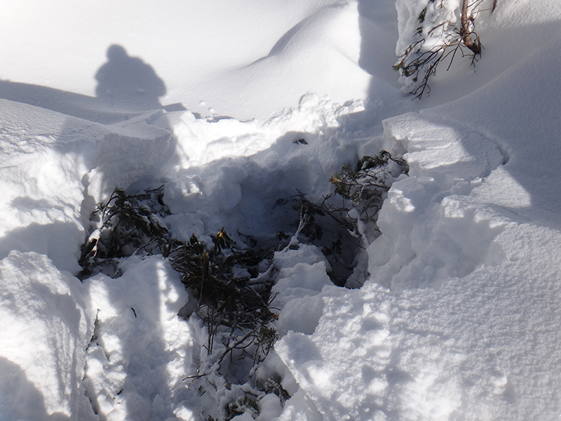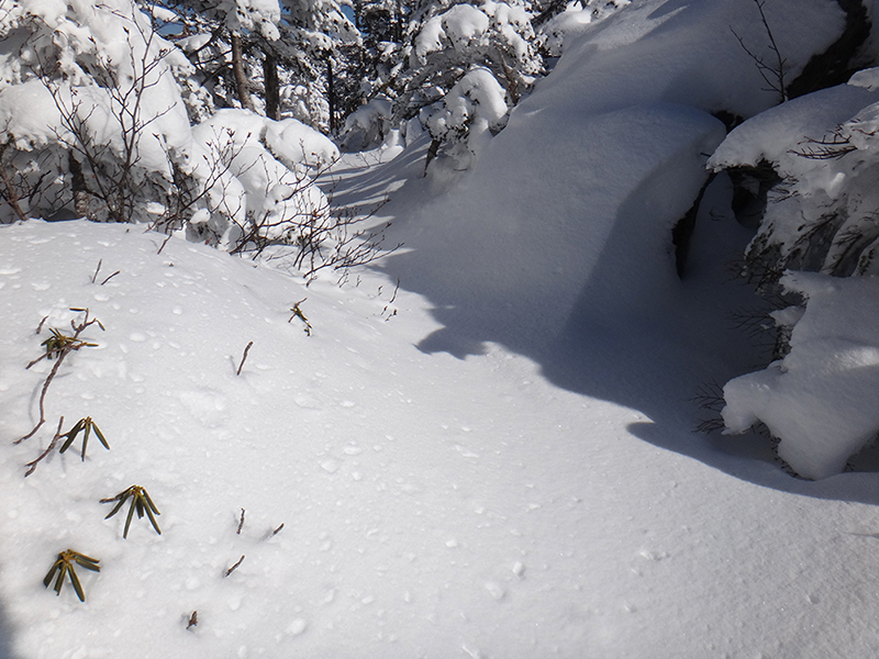 一旦ヒュッテまで戻りここからは三ッ岳を目指しました。一応トレースは入っていたのでアイゼンのままで踏み込みます。でもそれも束の間5分も歩かないうちにトレースは消え、まっさらの雪面がまぶしく輝くばかり。どうやら先行者はここから引き返したようでした。今日の目的は偵察だけでなく正月休みでなまった体に活を入れることでもあるので、躊躇なく深雪へ踏み込んでゆきます。深いところは腿の付け根ぐらいまではあるので久し振りに悪戦苦闘。意地でもスノーシューを使わずに進みましたが、不覚にもルートを外れて雪穴に転落。シャクナゲとハイマツの間の空間に胸まで落ち込み、少なからず怖い目に遭いました。何とか脱出し、観念してスノーシューを装着。しばらく進みましたが三ッ岳の岩場手前のブッシュ帯のルートが掴めず撤退を決めました。