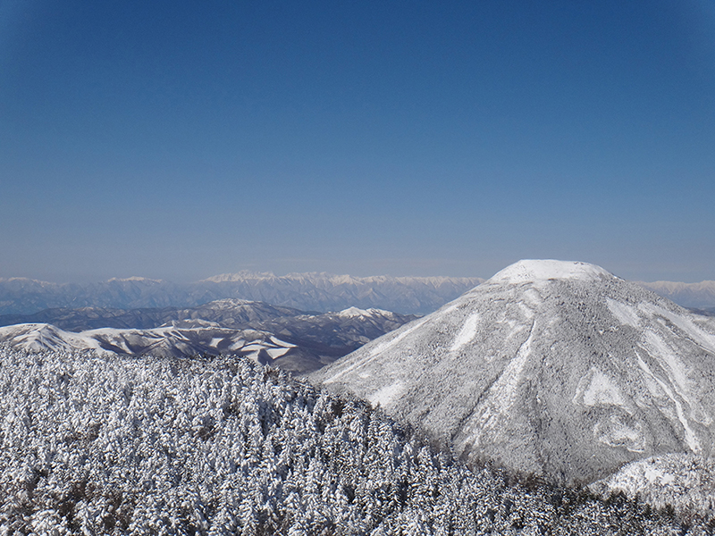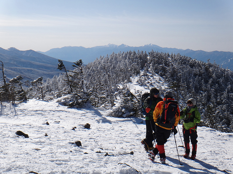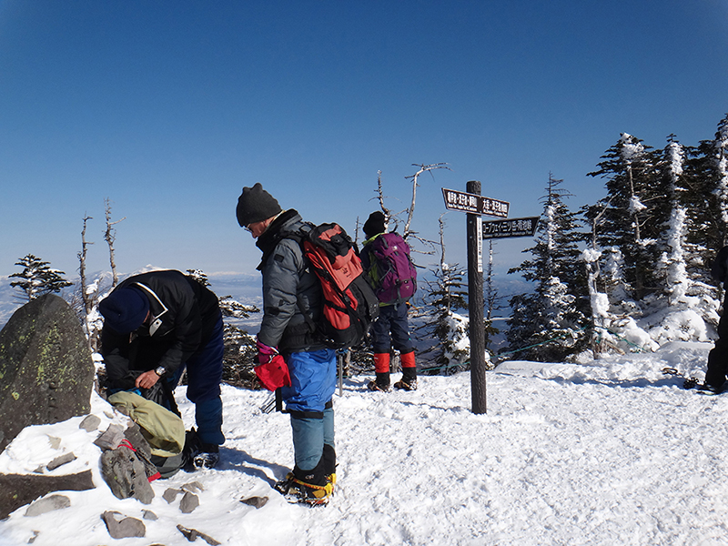 朝からもったいないくらいの快晴。9:40のロープウェイでは同僚ガイドのツアーや甲府のアウトドアショップオーナーとも遭遇し、コンディションの良さを喜び合いました。山頂駅からは新雪が素晴らしい風景の中をまずは北横岳へ向かいます。平日とあってか登山者も多くはありませんが、トレースはしっかり固められていました。久し振りのアイゼン歩行の感触を楽しみながら、ほぼ予定タイムで北横ヒュッテへ到着。ここから山頂まではひと登りです。南北山頂は相変わらず風は強いですが、日差しがあるので多くの登山者が写真撮影に余念がない様子。360°の展望はいつになく素晴らしく、北アルプスが御嶽から白馬まで見渡せ、妙高方面も手が届くほどでした。