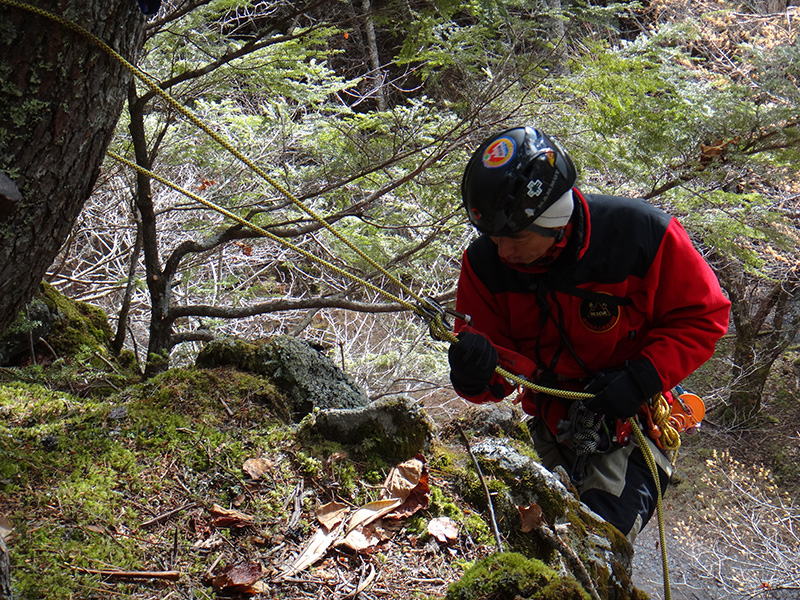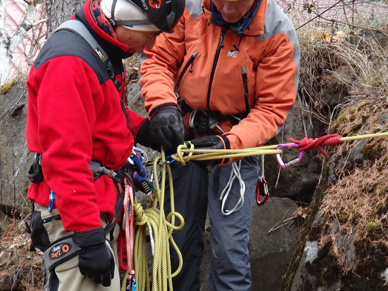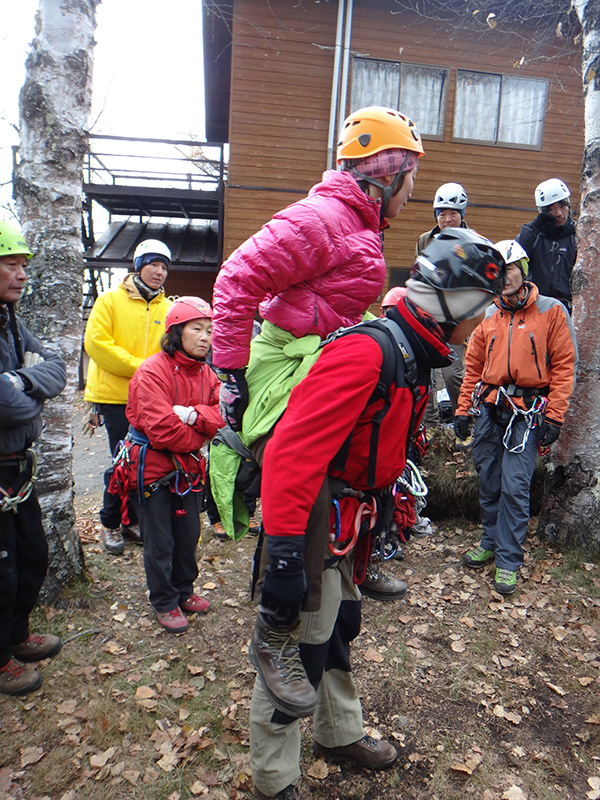 懸垂下降、フィックスロープ、背負い搬送の三種の技術を改めて確認し合いましたが、とにかく寒さが半端でなく、参加者全員終始震えっぱなしの講習会でした。