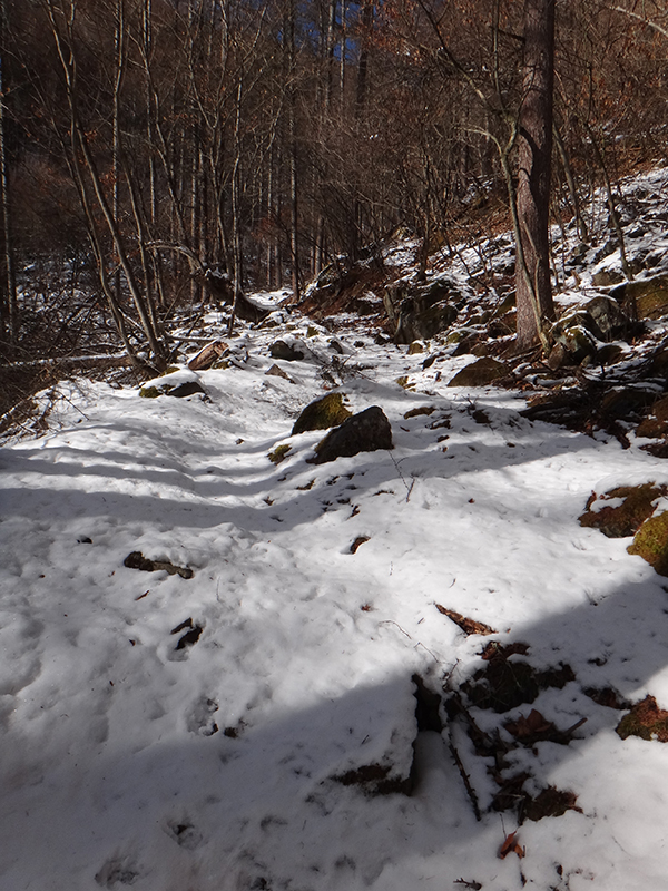 唐松林を縫うようにつけられた登山道。雪が出てきました。