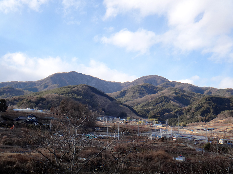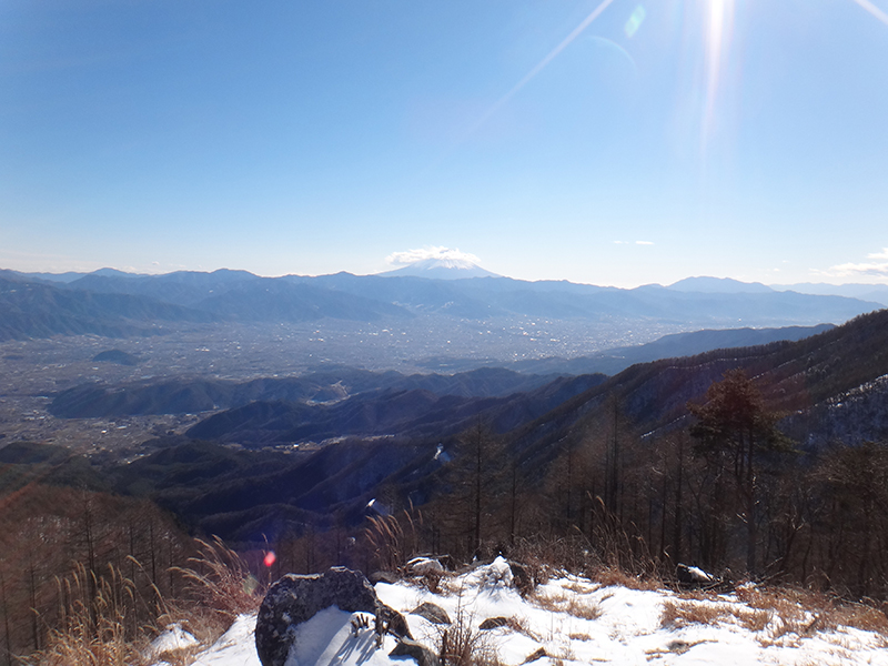 山頂から。甲府盆地の彼方に富士が焦点を結びます。