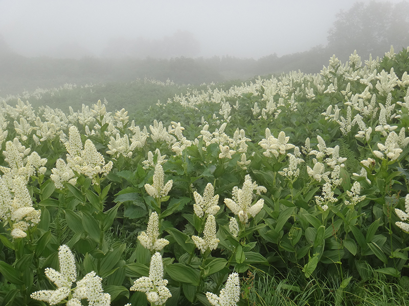 それでも種池山荘まで来ると雨も上がり、コバイケイソウの群落が霧中に浮かぶように迎えてくれた。