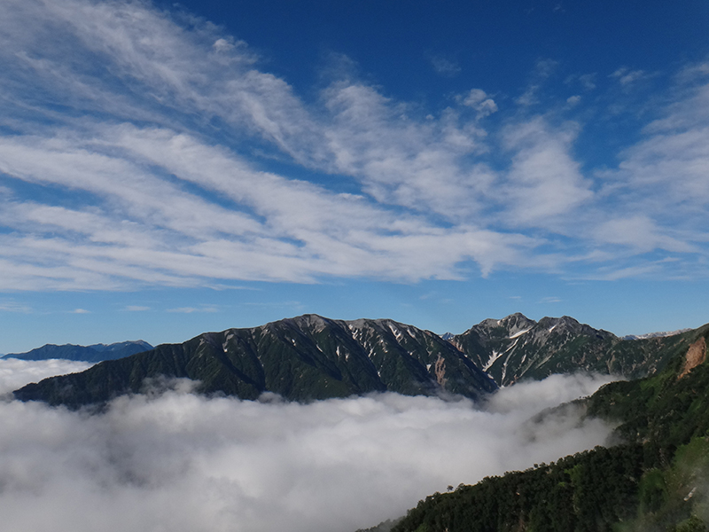鹿島、剣、立山、針ノ木、蓮華、遠く富士、北岳、八ヶ岳も雲海に浮かんでいる。