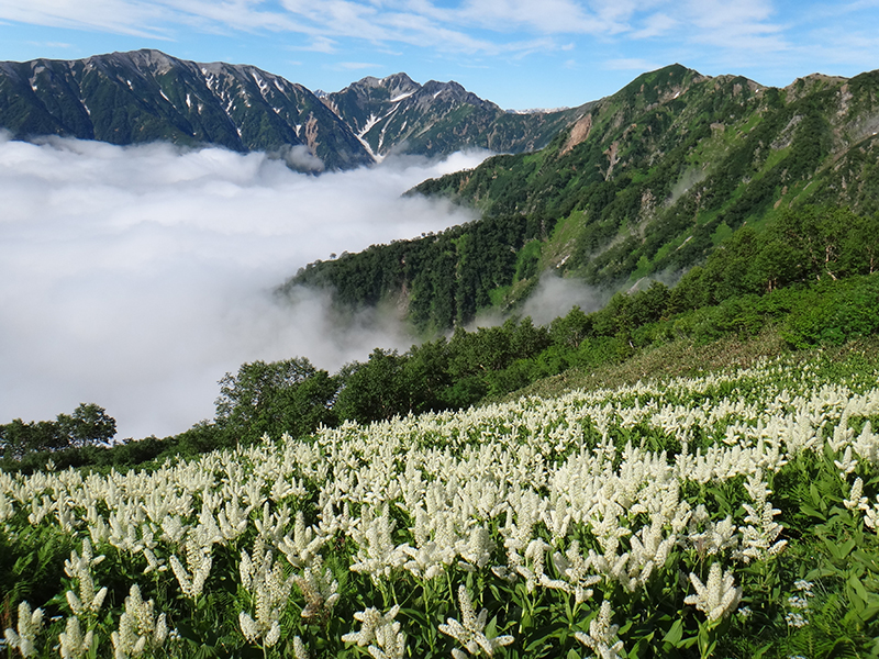 雲海の扇沢とコバイケイソウの群落が好対照。