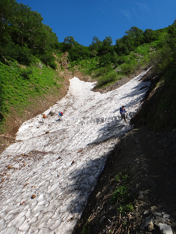 柏原新道上部には雪渓も残る。