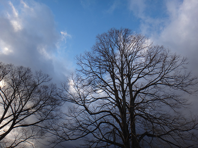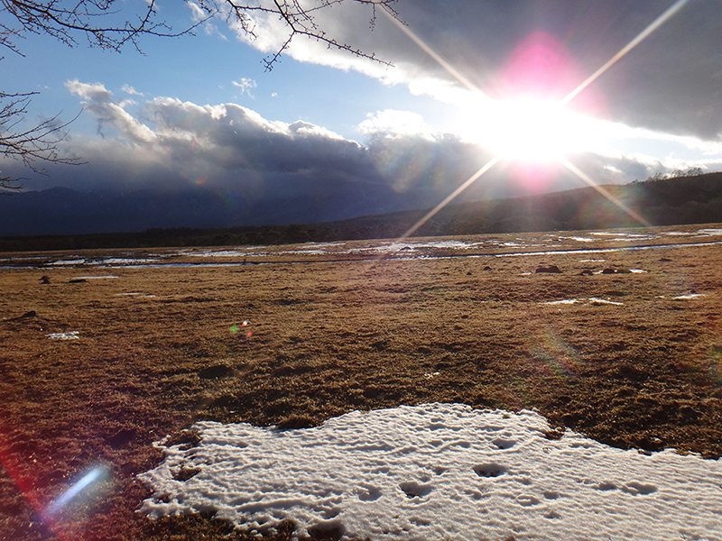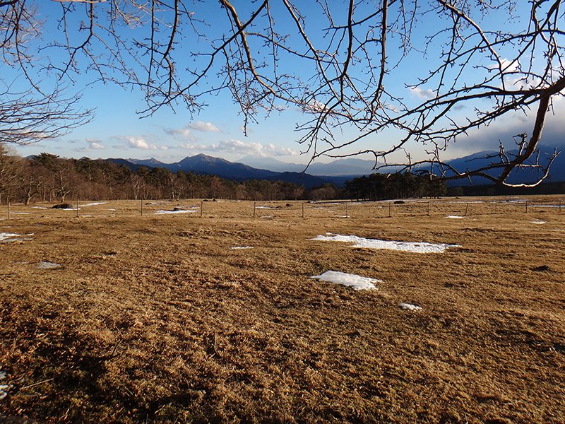 ここからは少し戻って、エスケープルートを辿って県営牧場へ出て起点まで周回しました。北西側を覆う雲間から落日が漏れて、冬枯れた草地を照らす光景が凄絶感を伴って美しいほどでした。