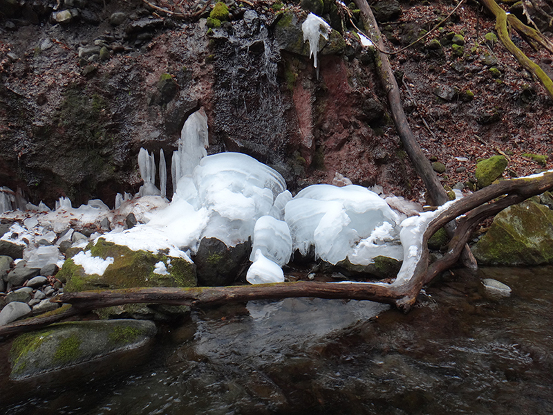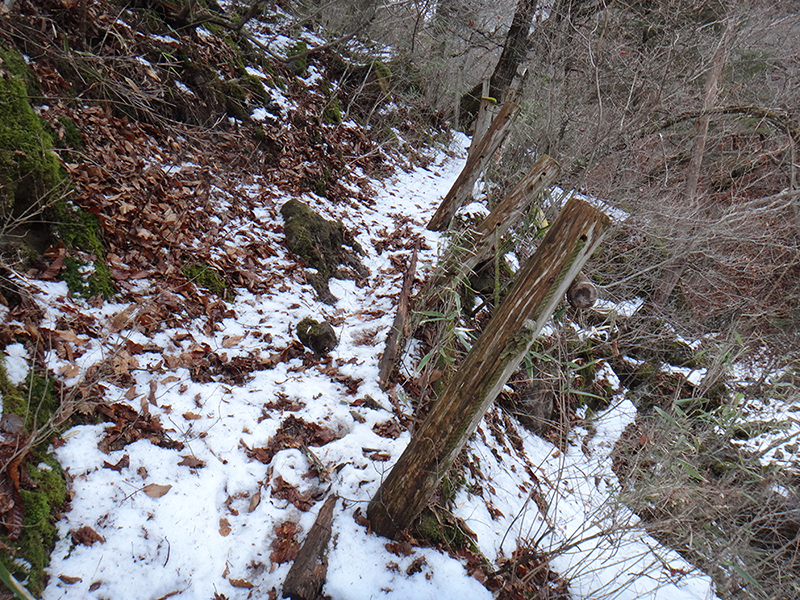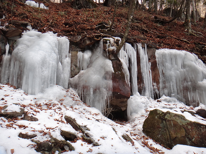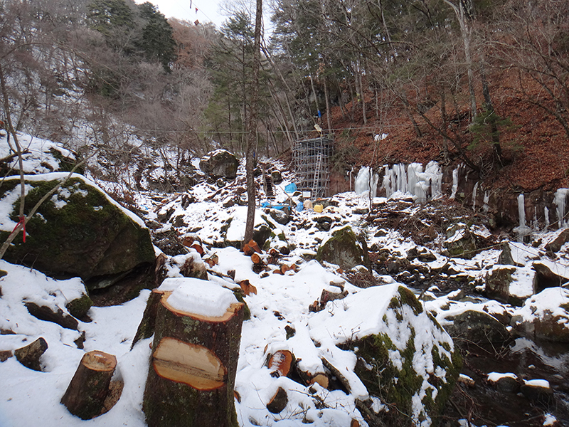 午後、雨の止んだのを幸いに吐竜の滝を起点に川俣川渓谷の状況確認に行ってきました。歩道区間の上部で長い間流出していた橋の架橋工事が始まっていると聞いたので、氷瀑の出来も含めての下見です。路面状況ですが、「覚円峰」までは所々うっすらと残雪があるくらいでしたが、その上部はチェーンスパイクくらいはあった方が無難です。昨日は気温も高かったこともあり腐った雪でしたが、凍結すればスリップの危険があります。「獅子岩」の徒渉点付近は広範囲に伐採がなされ、単管パイプの足場が組まれて大規模な工事を思わせる風景となっていました。どんな立派な橋が架かるんでしょうか。通行止めとなっている「天井岩」ルートを辿り、やはり橋の流出箇所を飛び石伝いに徒渉して「蘭庭橋」まで沢沿いを歩きました。この橋は健在ですが、木部が腐食し、欄干の鉄骨もひしゃげて不安定なので、今は通行禁止になっています。手を入れれば改修できそうですので、このままではもったいないと感じます。