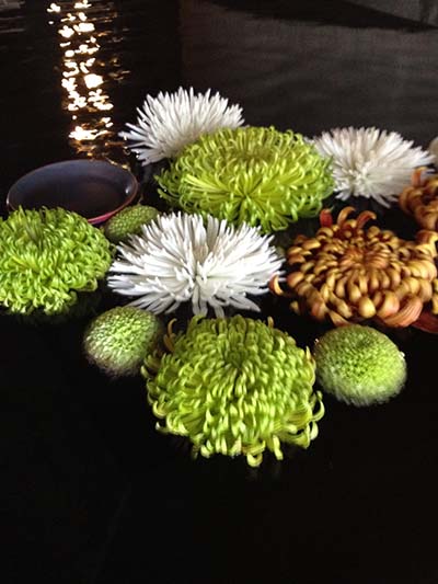 水に浮かぶ菊花の散華が妖しく灯る。