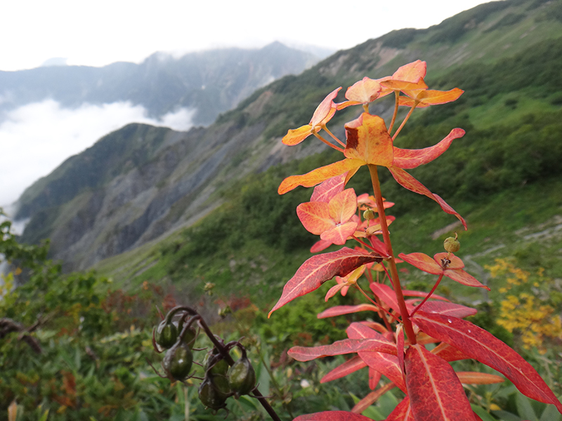 紅葉したハクサンタイゲキ。トウダイグサ科も見分けの難しい種が多い。