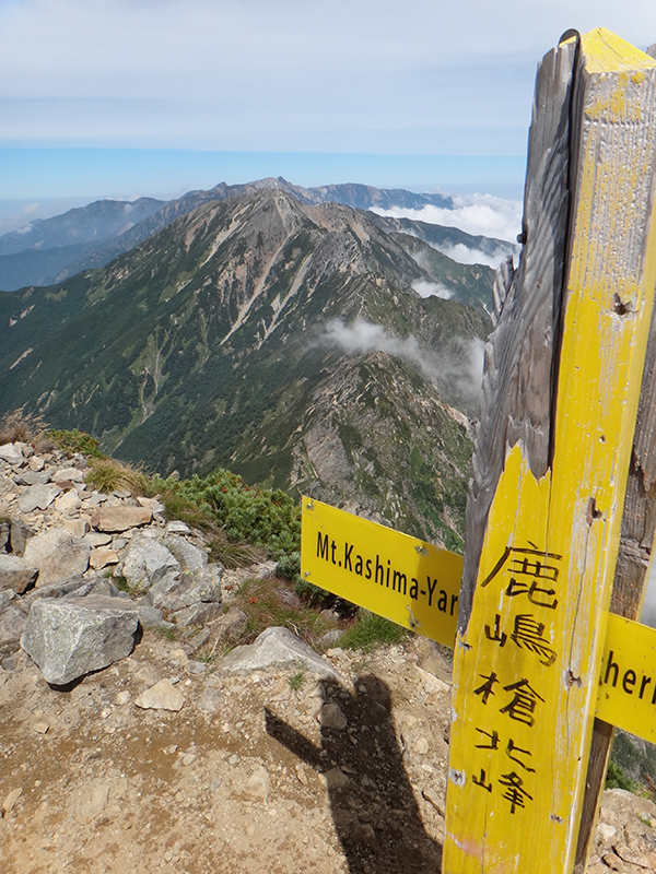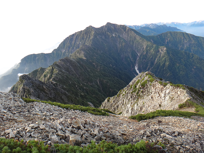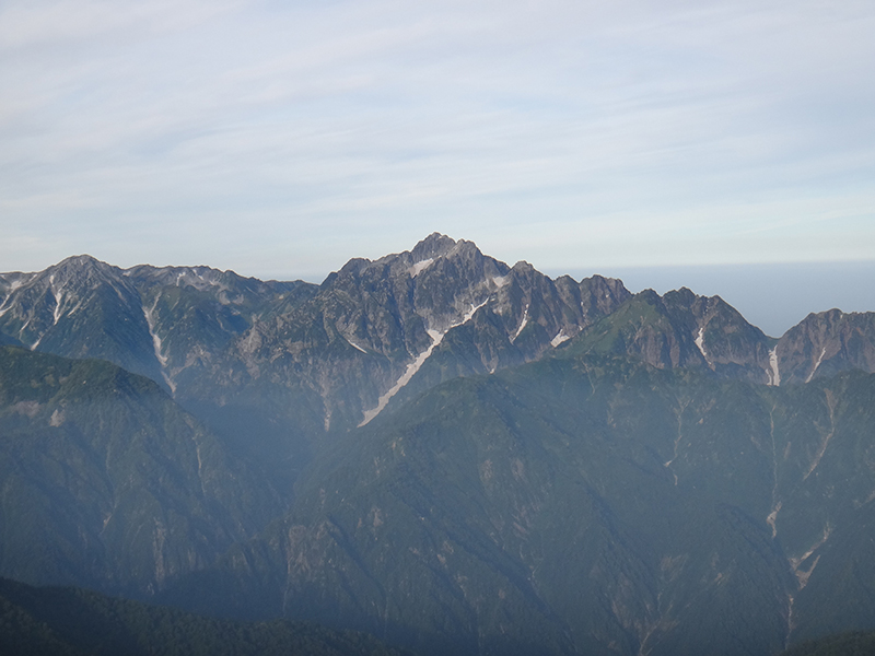 鹿島槍北峰から来し方を振り返る。奥に唐松、去年歩いた白馬乗鞍も見える。