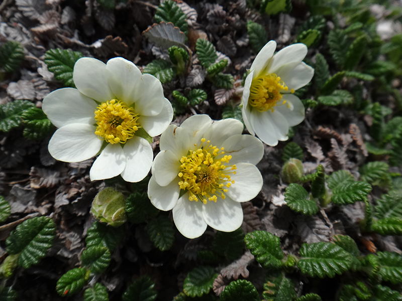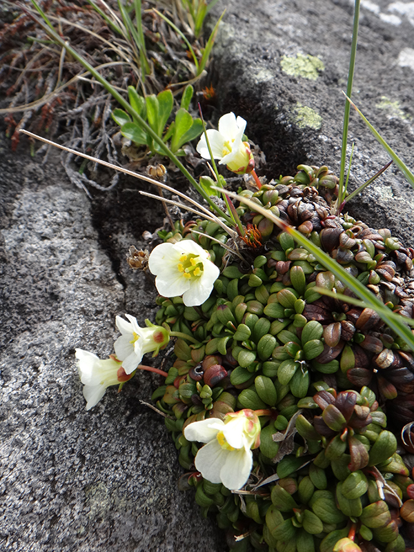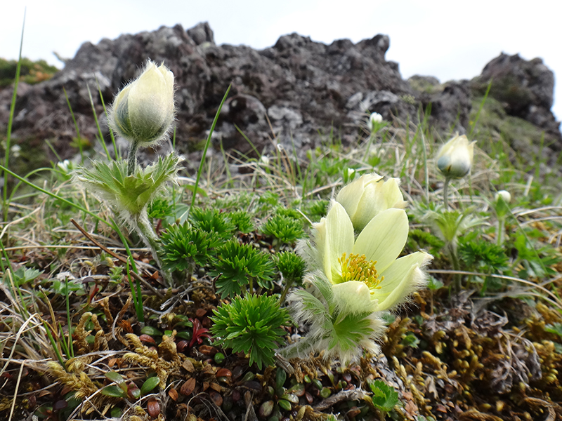この時期が旬のツクモグサも花付き良く群生していて、快晴ならではの全開の花形を見せているものもありました。