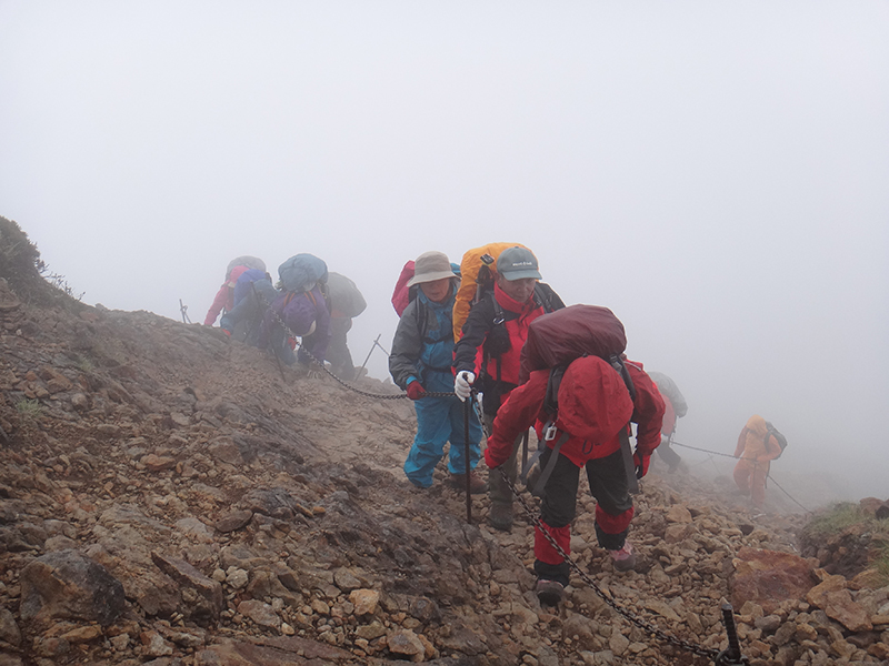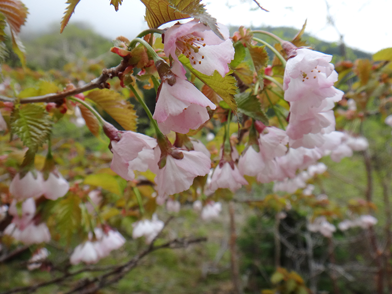 翌日は濃霧の中を出発。赤岳山頂は無展望でしたが、下るにつけ霧も晴れ、ウラジロナナカマドの新緑が目に鮮やかに、そして満開のミネザクラのお花見も堪能することが出来ました。