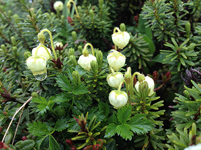 悪沢岳からは少し植生も変わり、チョウノスケソウやチングルマが路縁を彩ります。 中岳との鞍部へ至る急路を下り、中岳避難小屋へ。 その途中でとうとう降り出しました。