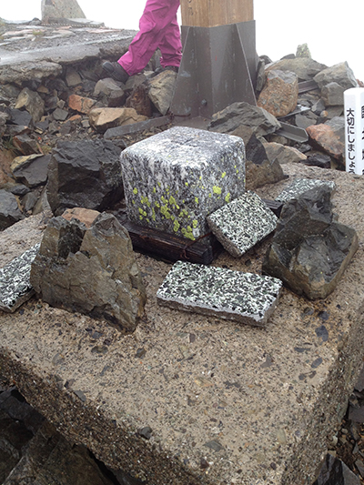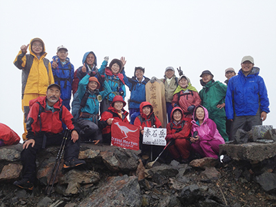 翌日も雨具着用で出発。 大聖寺平までは晴れ間も覗き、振り返れば昨日越えてきた悪沢から前岳の峰が雲間から姿を見せてくれました。 その後小赤石への登り途中で再び雨、どうして赤石って中々晴れないんだろう。 赤石山頂で記念撮影後、赤石避難小屋で暫し休憩。