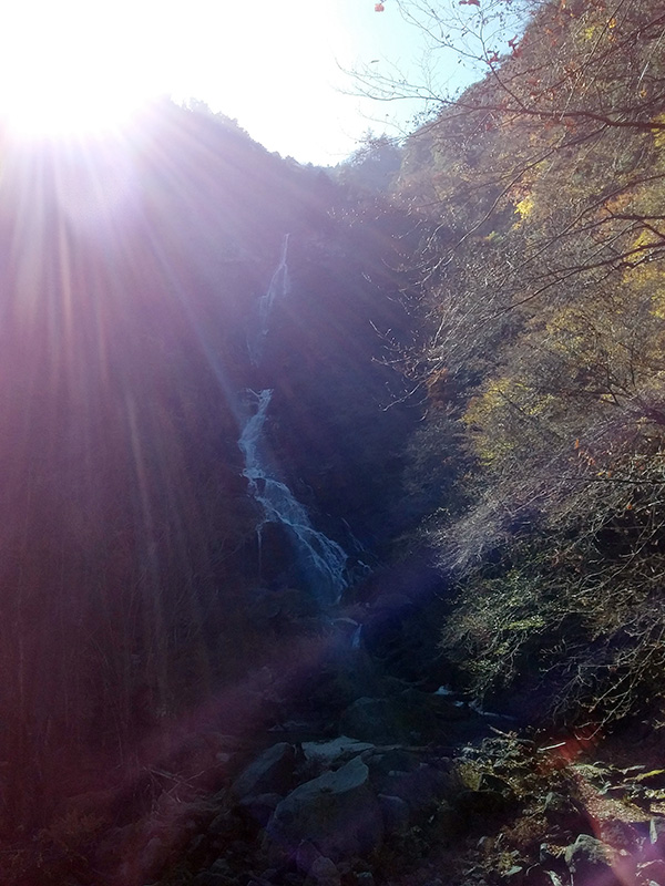 精進ヶ滝。落差121mを誇ります。生憎陰の中に埋もれていました。