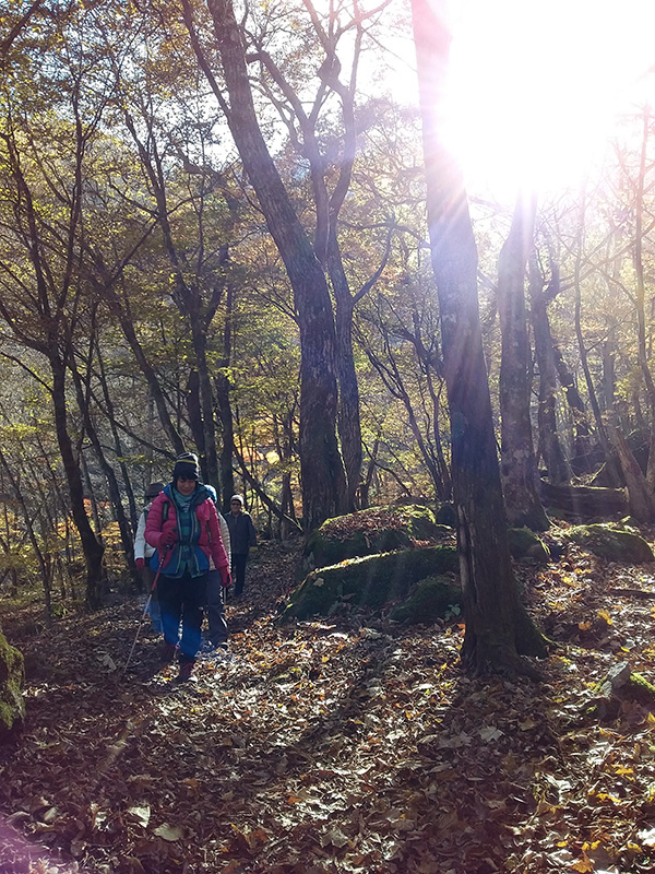 紅葉は既に最盛期を過ぎていましたが、散り残った木々の葉を透かして午後の日差しが黄金色に輝いていました。