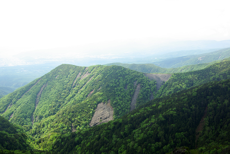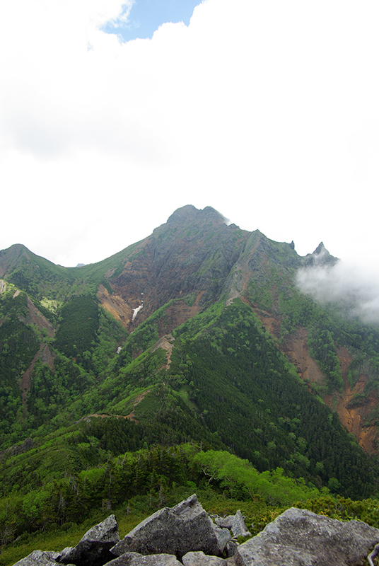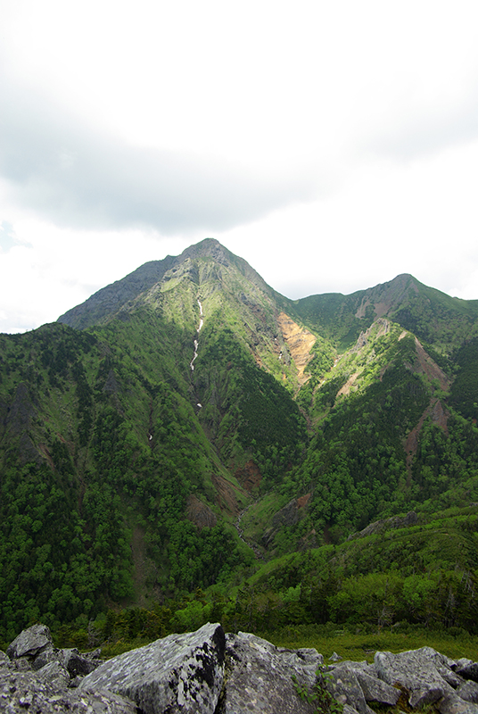 牛首山取り付きの賽の河原から。赤岳山腹の緑が鮮やか。