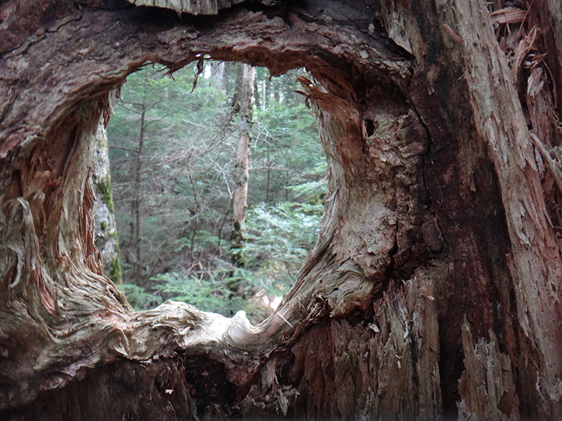 時折響く鳥のさえずりが厚く堆積した苔や古木の樹皮からたちのぼる霊気にこだまして、かつてはどこの山もそうであったであろう山気の満ちる異界を現出させている。