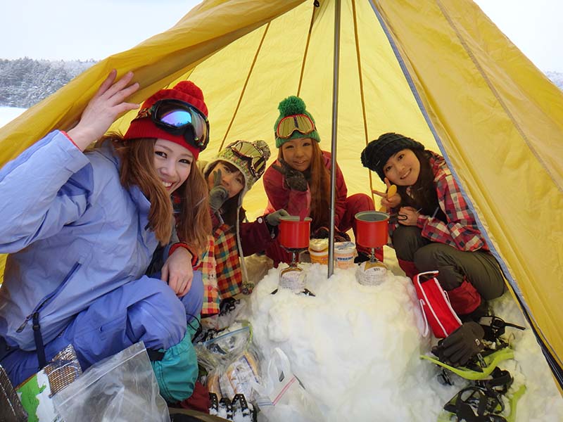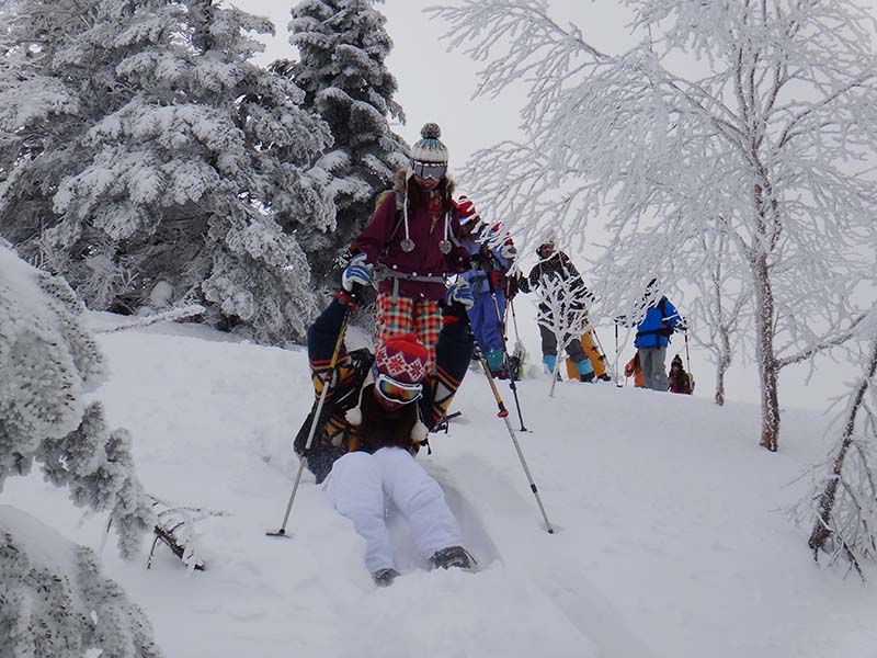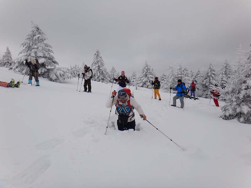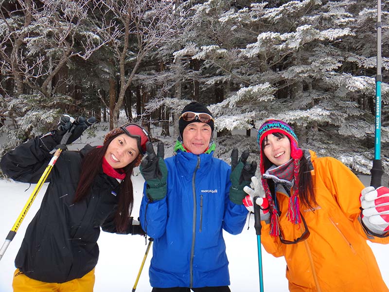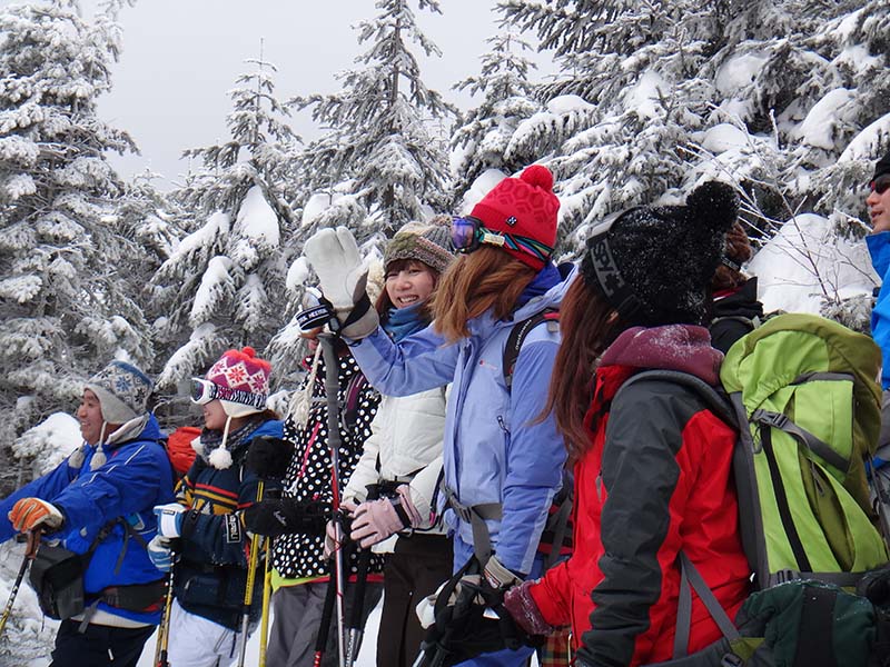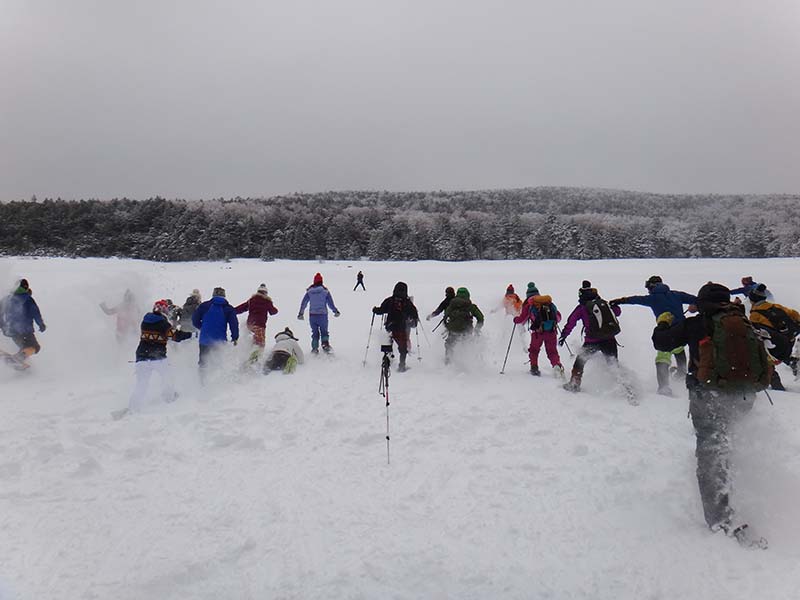 巷に「山ガール」や「山女子」の言葉が氾濫するようになって久しいけれど、中々その実態を目にする機会はありませんでした。 ところが今回集まったのはまさにそんな人々。 さすがアウトドアショップの企画とあってウェアもそれらしく決まった彼女達、少し曇り気味の北八ヶ岳を華やかに彩ってくれました。 若干混じった男子達(ちょっと存在感が薄かったかな)も含め、おあつらえ向きの新雪、深雪を蹴散らして、嬌声と共にはしゃぎ回るパワーには思わず脱帽。 池の横断レースにも完敗し、いわゆる「ジェネレーションギャップ」を痛感させられた一日となりました。