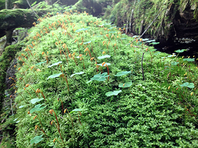 下山路で。北八ッ特有のナースログ。苔が美しい。