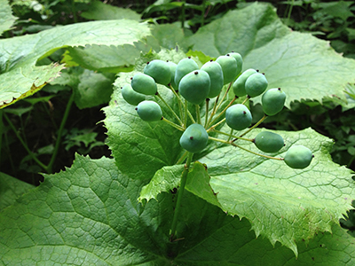 それでもえぐれた登山道の日陰にはキヌガサソウが控えめに咲いている。