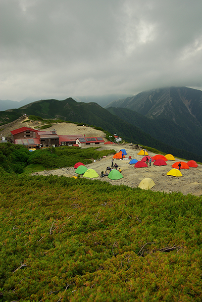 蝶ヶ岳ヒュッテのテン場には山口からの高校生集団がそれぞれ大型テントにひしめいている。