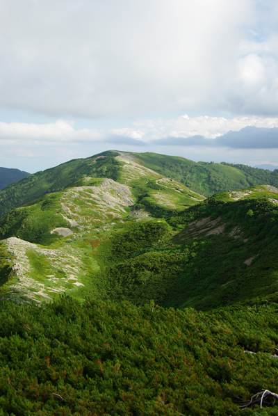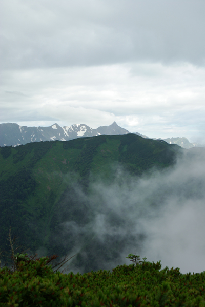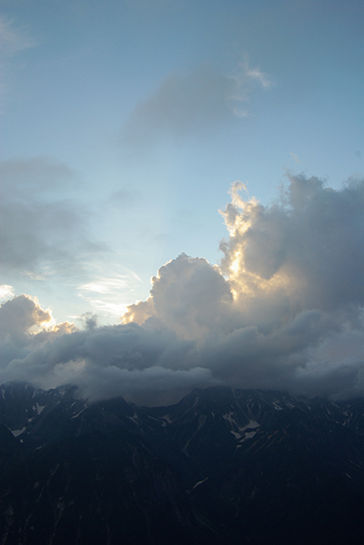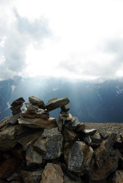 それでも異様に切り立って見える大小の谷とカールに残る雪渓のコントラスト、雲間から落ちるビロードのような分散光がこの山塊を荘厳に彩っている。