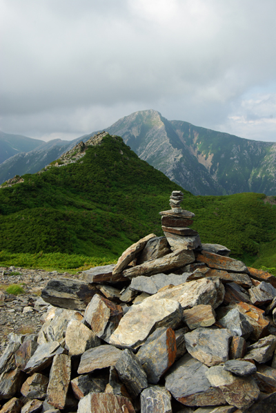 それでも異様に切り立って見える大小の谷とカールに残る雪渓のコントラスト、雲間から落ちるビロードのような分散光がこの山塊を荘厳に彩っている。