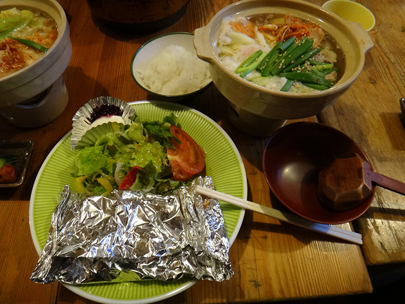 夕食は鮭のホイル焼きと鍋。豪華で暖まるメニューでした。