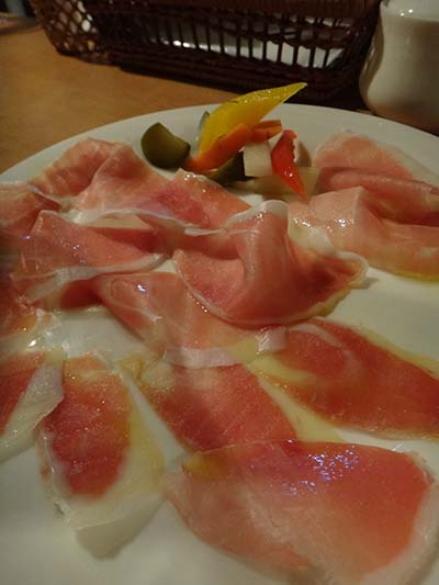 この店自家製の生ハム。これは豚だが、イノシシのものも熟成中。