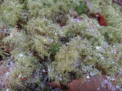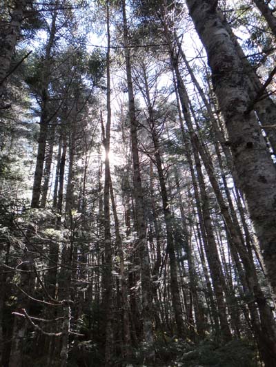 また林立する陰樹のシラビソの合間から差し込む斜光線が、銀と深緑のストライプとに地表を染め分けて、熱と氷の世界をも交互に演出してくれました。