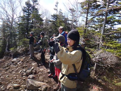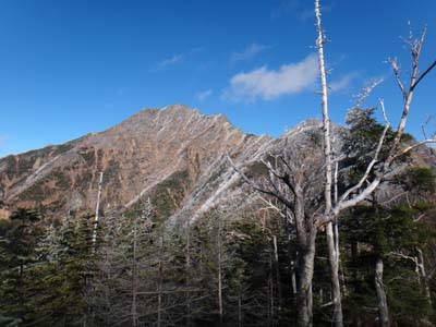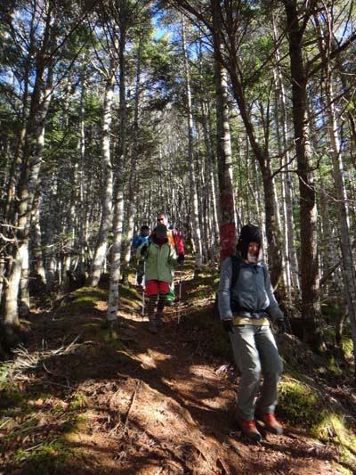 きわどいがれ場を乗り越し、シラビソ、コメツガの密生する一直線の尾根をひたすら登ります。