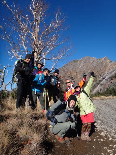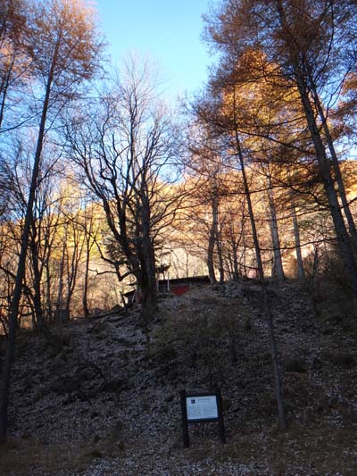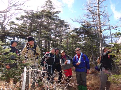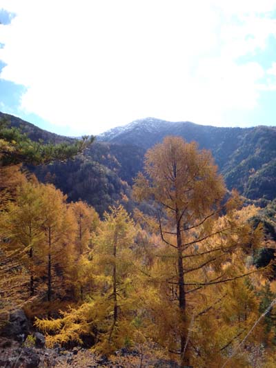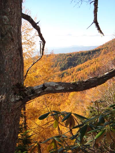 亜高山帯を抜けると燃えるように壮麗なカラマツの褐葉が残照する、晩秋の夕暮れが私たちを待っていてくれました。
