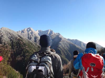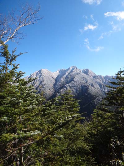 連日の好天を受けてこの日の朝も放射冷却厳しく、2000m辺りを境に上部山稜は霧氷に覆われています。