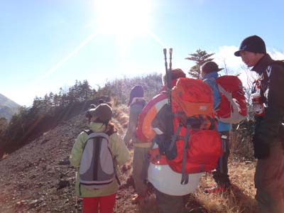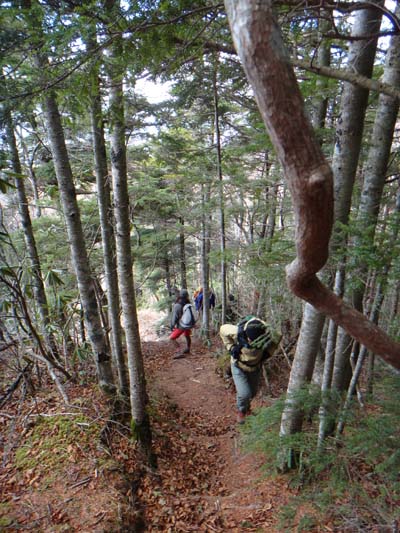 落ち葉の散り敷いた古い林道後を辿って、やがて旭小屋へ
