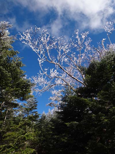 山頂に近づくにつれ陽光に融け落ちた霧氷が雪のように降り注ぎます。